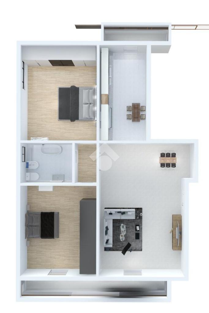 Varcando la soglia di ingresso ci accoglie un soggiorno con uscita su un balcone di 6 mq ed una cucina abitabile di 9,7 mq con uscita su un secondo balcone di 2,5 mq.