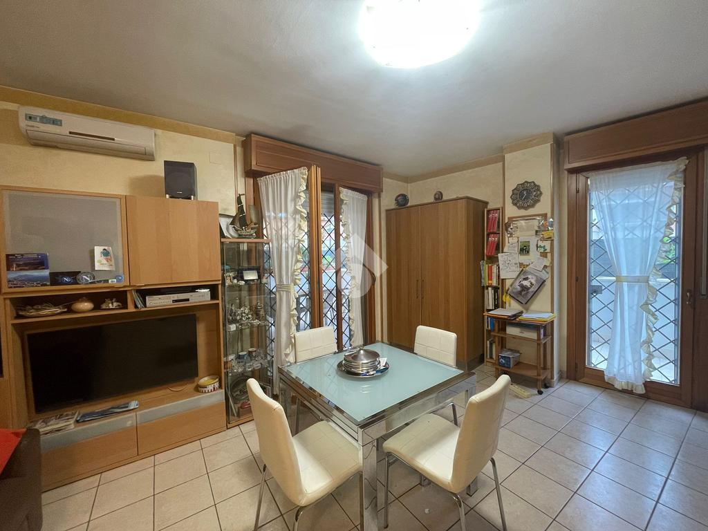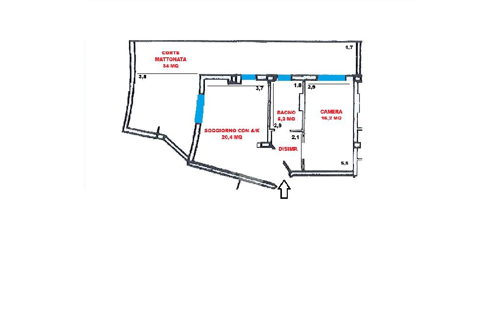 L'appartamento è composto da: Ingresso, soggiorno ed angolo cottura di 20,5 mq circa con doppia uscita sulla corte mattonata con tende da sole, barbecue e lavabo.
